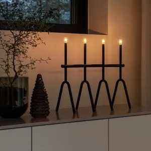 Denne varianten fra Konstsmide i svart stål har fire lys og den har lysene i samme høyde.